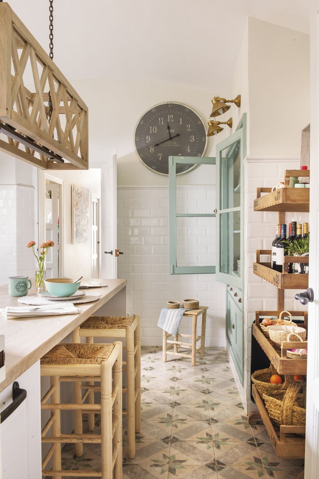 I love this design! The pistachio colored cabinets, the open racks full of baskets of fruit, and the bronze sconces that complete the French provincial feel.