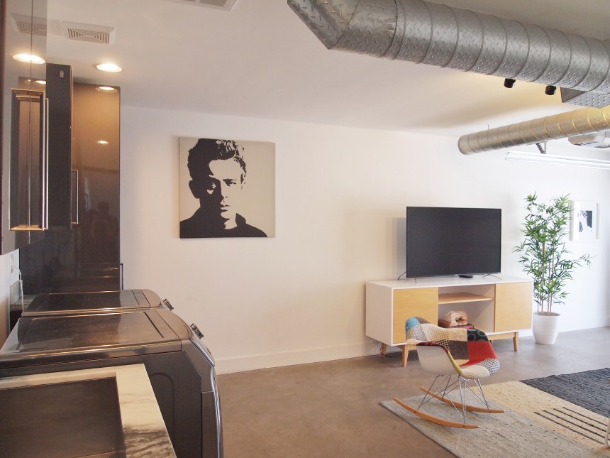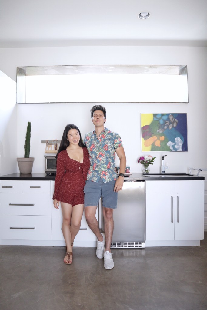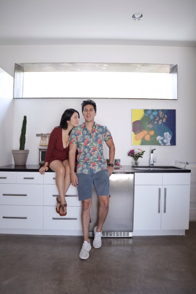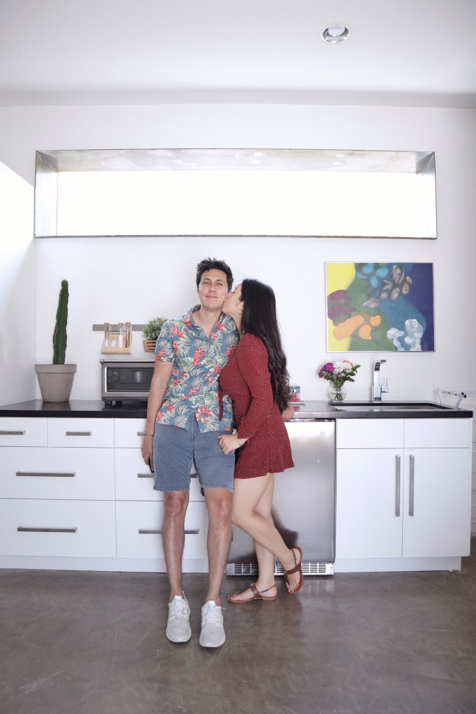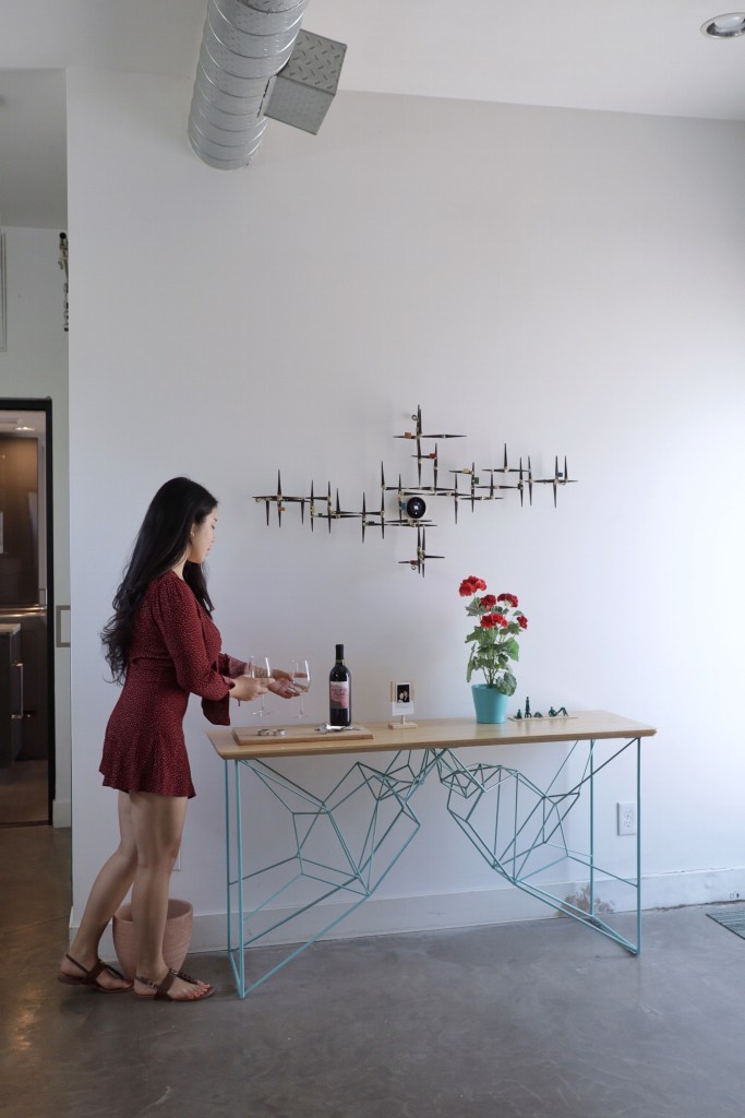 This AirBnB is a standalone guest house in a loft/studio layout with a modern/artsy design (see exposed ductwork)! When you first enter, there is a console table with complimentary wine and an AC module (thank goodness because AZ heat is too real) hidden in a structural art piece. We placed a stand with one of Michael and I’s polaroids for a personal touch 🙂