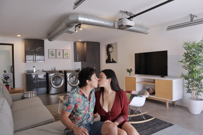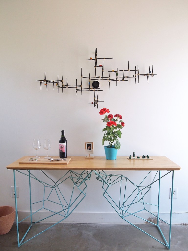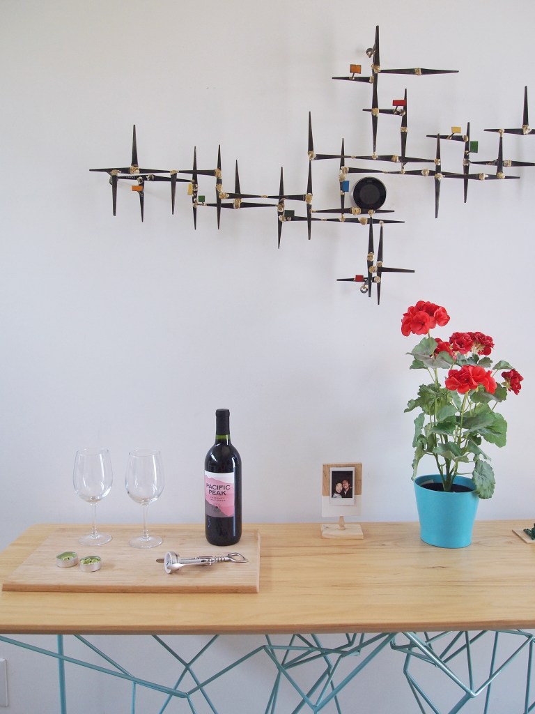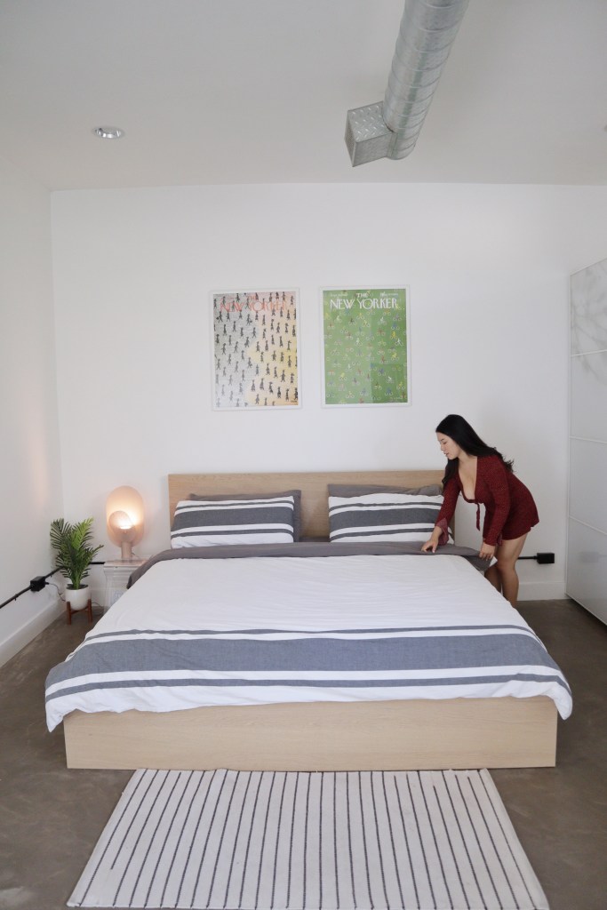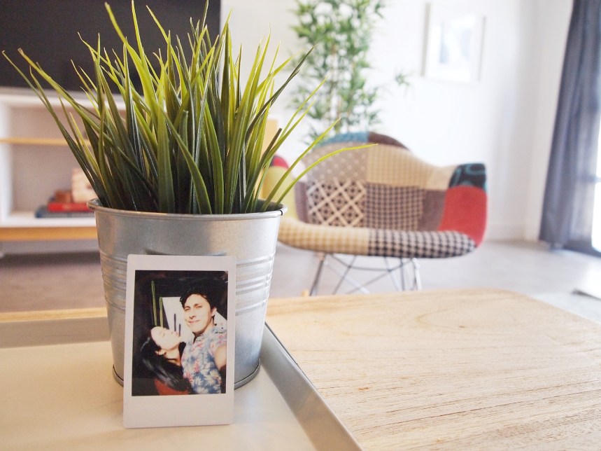 This AirBnB is a standalone guest house in a loft/studio layout with a modern/artsy design (see exposed ductwork)! When you first enter, there is a console table with complimentary wine and an AC module (thank goodness because AZ heat is too real) hidden in a structural art piece. We placed a stand with one of Michael and I’s polaroids for a personal touch 🙂