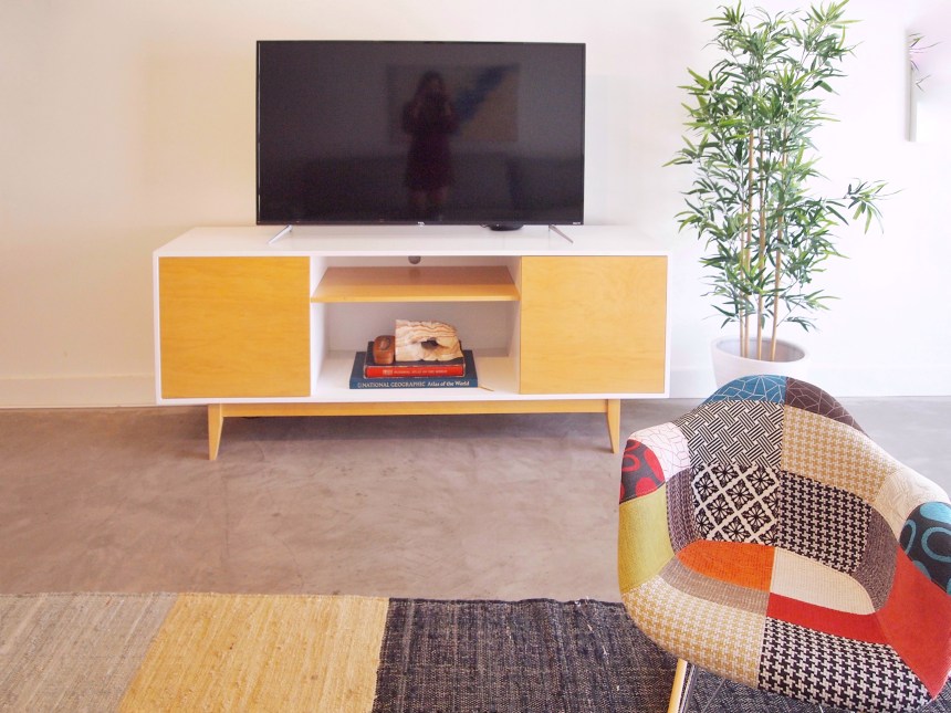 The star of the living room is obviously the glass garage door – I love it! It’s like a floor-to-ceiling window bringing in so much light. The media console had a rock decoration in the shape of the famous Papago “Hole in the Rock” – Michael and I actually went to that place so we loved the detail!