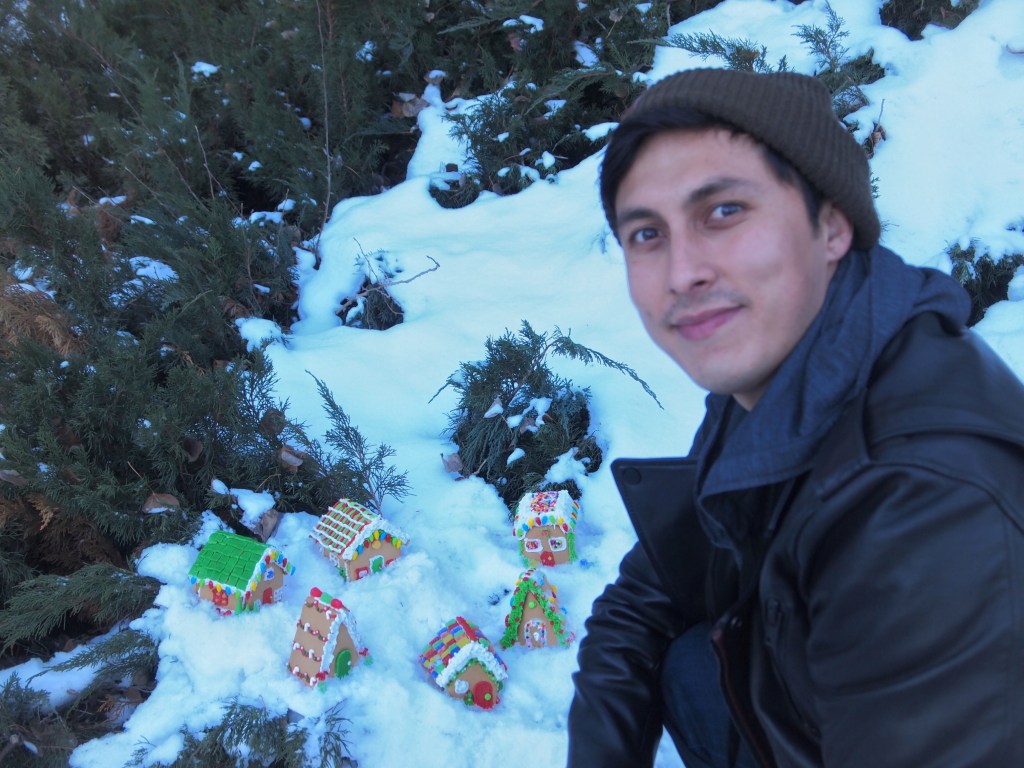 It seems easy enough to get the photo, but it was painfully cold >.< We had to punch the snow to make it look more powdery, break off large chunks of ice to build the foundation, carve out precise burrows to nestle the houses, and then shovel snow just enough to cover the bases. My fingers (even though I was wearing gloves) were starting to freeze – but I was really concerned about my toes lol. We were standing deep in snow and the snow was going straight through my Calvin Klein boots!! AND it was icy. At one point I fell and Michael pushed me the other way so I wouldn’t fall onto the houses LOL.