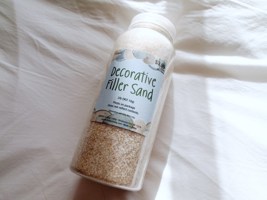 - Sand (I used this decorative sand but you can also get sand from your local beach/desert! Just make sure the sand is fully dry before you put it in the jar, otherwise it will stick to the jar and not look as clean)