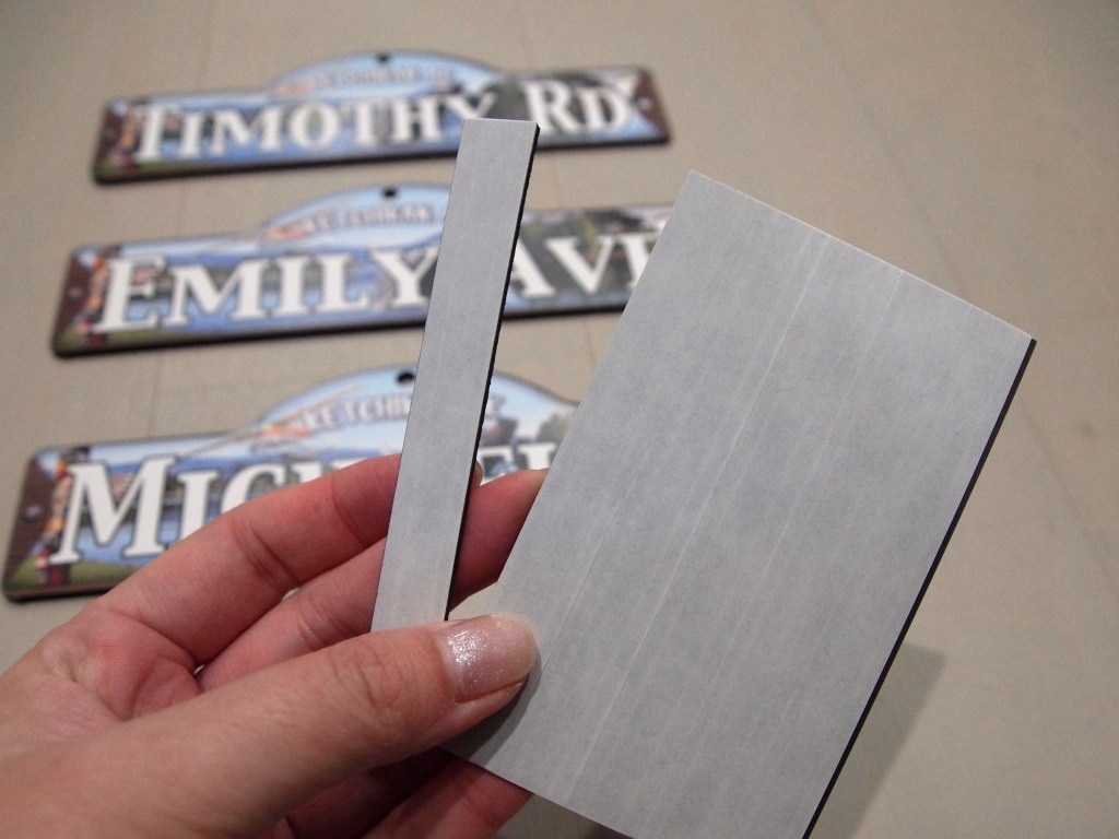 Today I have a quick arts & crafts project to share with all of you! My dad had gotten these souvenirs from Alaska — street signs with mine, his, and my boyfriend’s name on them. I thought it would be nice to create magnets out of them so they can be showcased on the fridge instead of being stuffed away somewhere.