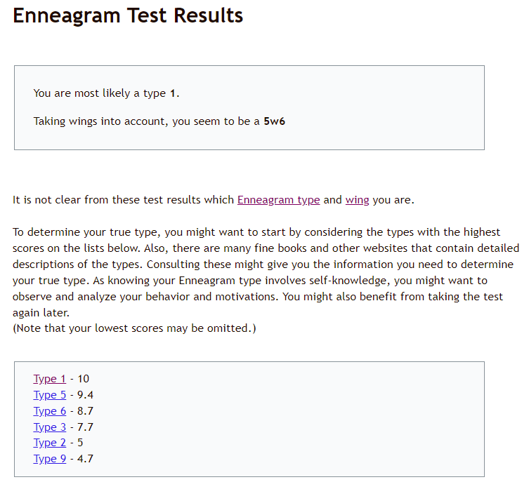 I am a Enneagram Type 1, aka “The Reformer” — perfectionists, responsible, fixated on improvement. Hmmmmmm I wouldn’t say it hits the nail on the head, but I guess if I had to choose 1 out of the 9 types that most matches me (just based on a quick glance) I probably would have thought I was a 1 or a 5 (TBH, I think I may be more of a 5 than a 1).