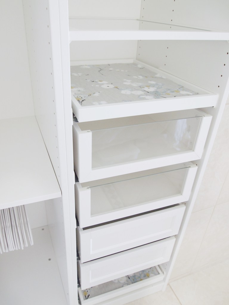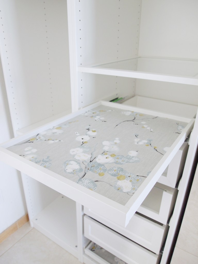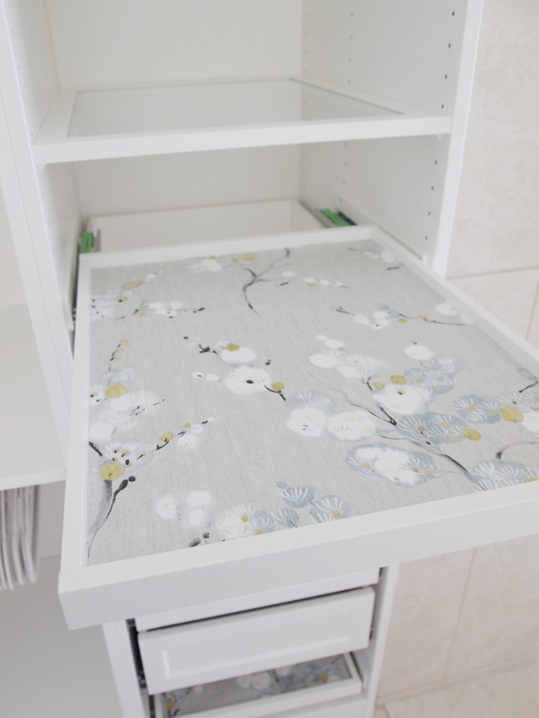 And lastly, my favorite part of my wardrobe, the gorgeous liners I used!!! IKEA sells grey liners for their pull-out trays which are nice because they’re felt and because they’re already sized perfectly. But, I decided to elevate and use my own liners (well actually I used a wallpaper) instead and I am OBSESSED. They’re so pretty that I don’t want to put anything on top of them because I want to see the print hehe. I lined both the top pull-out tray and the bottom pull-out tray.