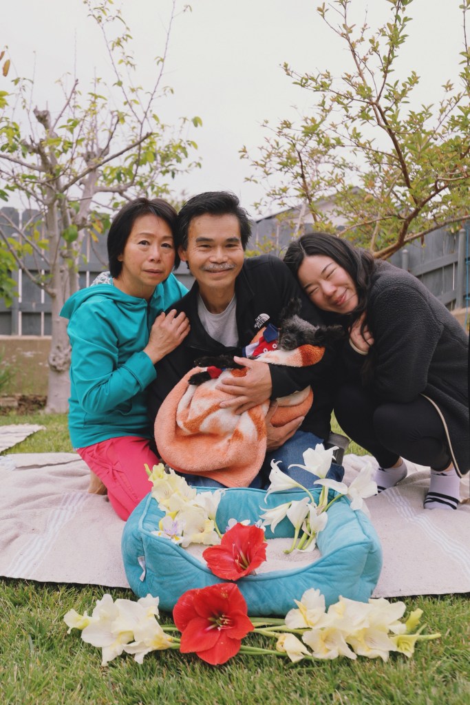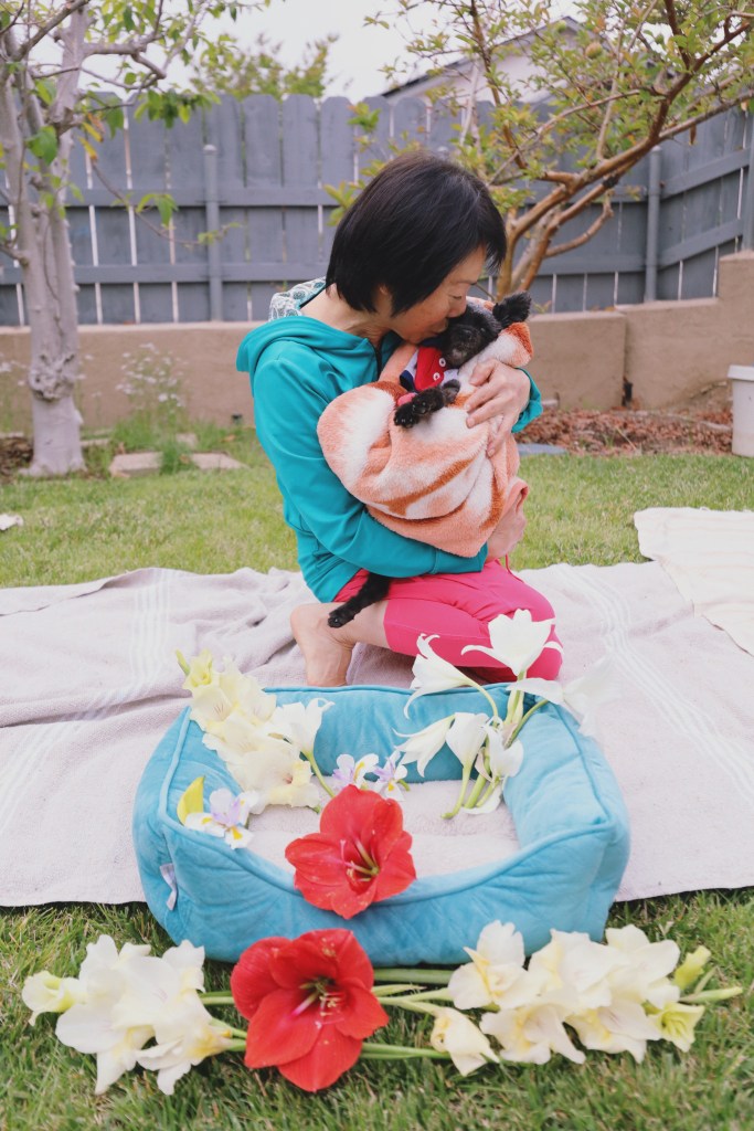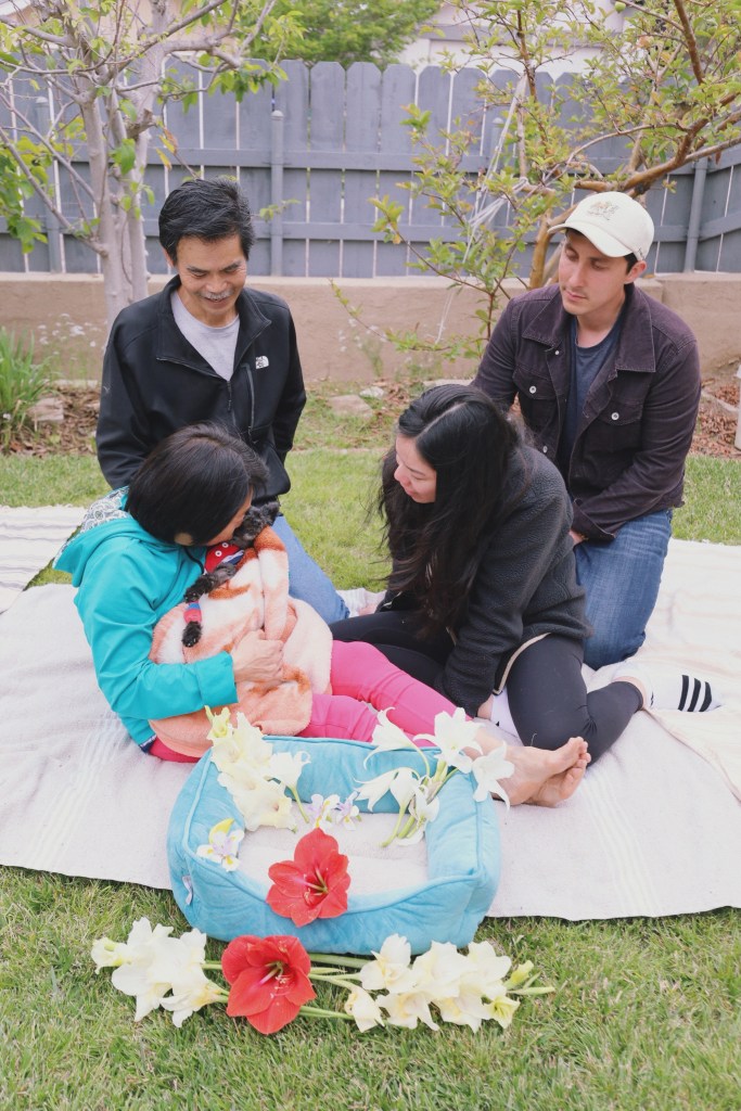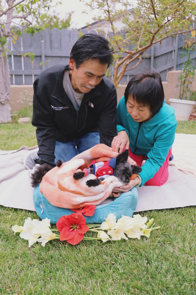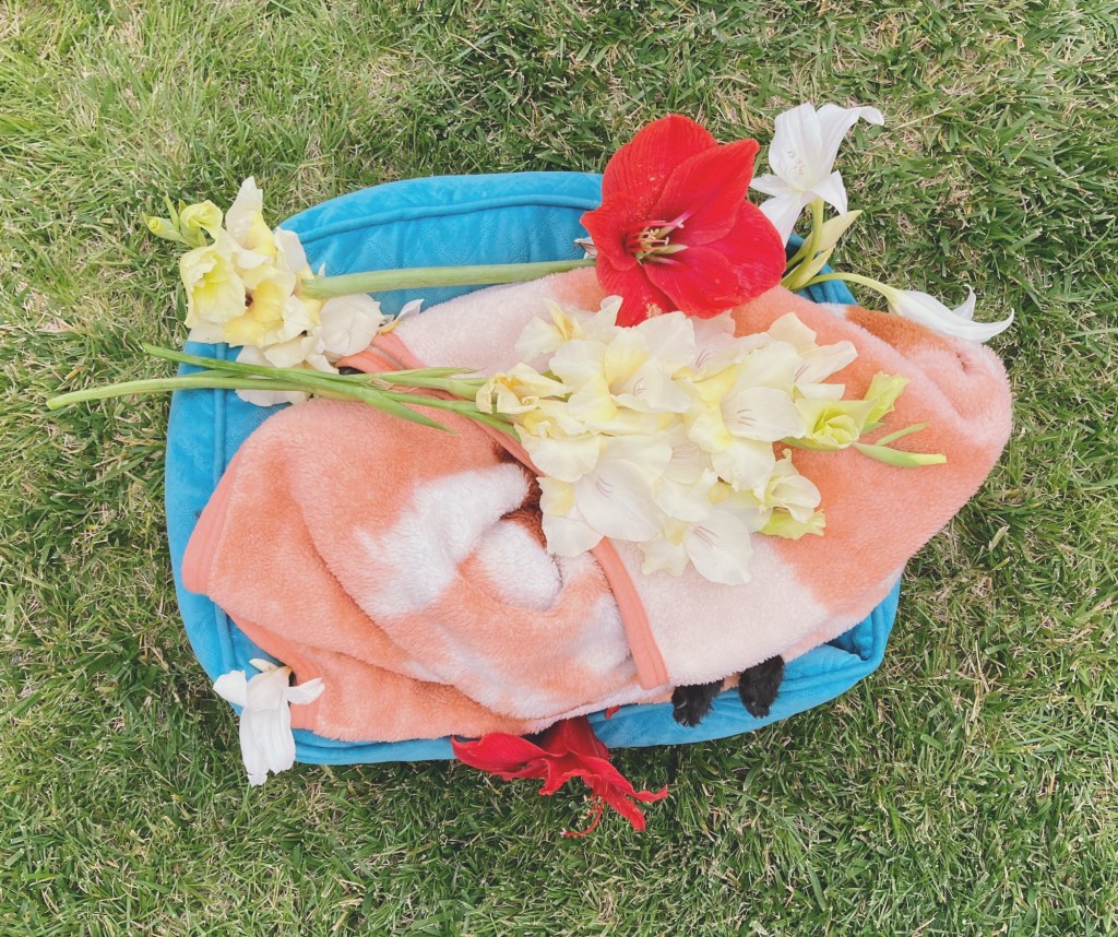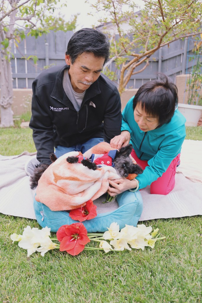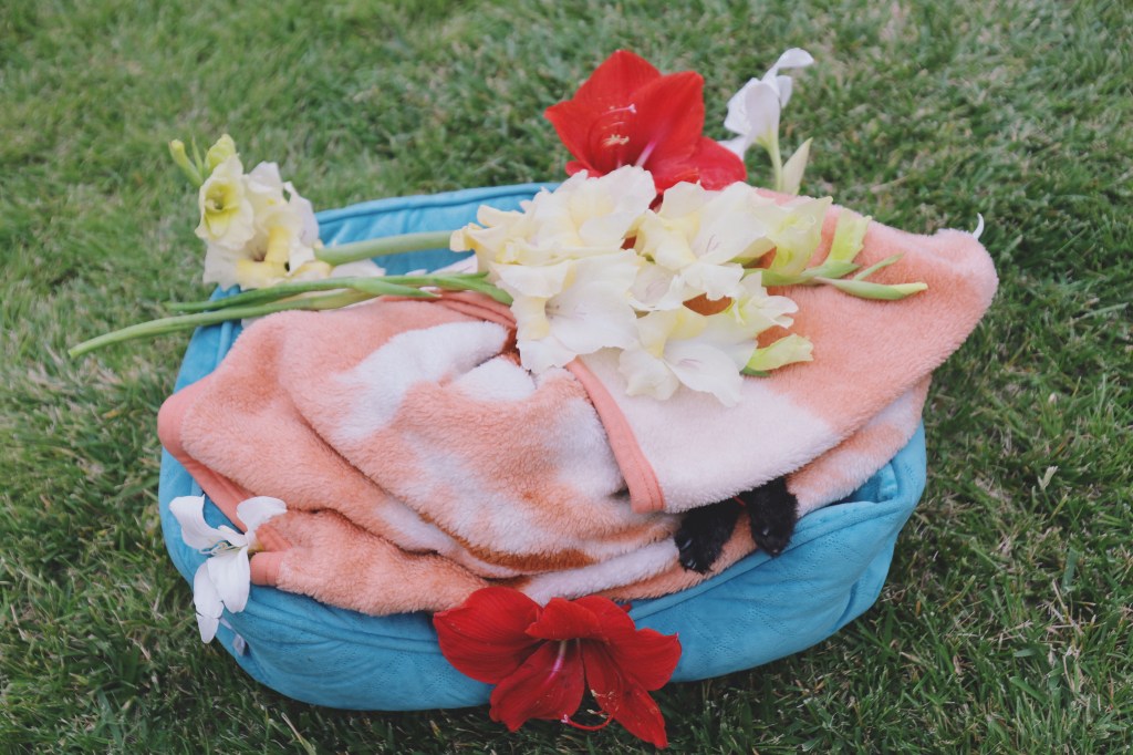 I rested there. In my dog bed. Wrapped up in a blanket. With flowers all over me. In my favorite place ever, our backyard. Staring at my Papa, Mama, and Jeje.